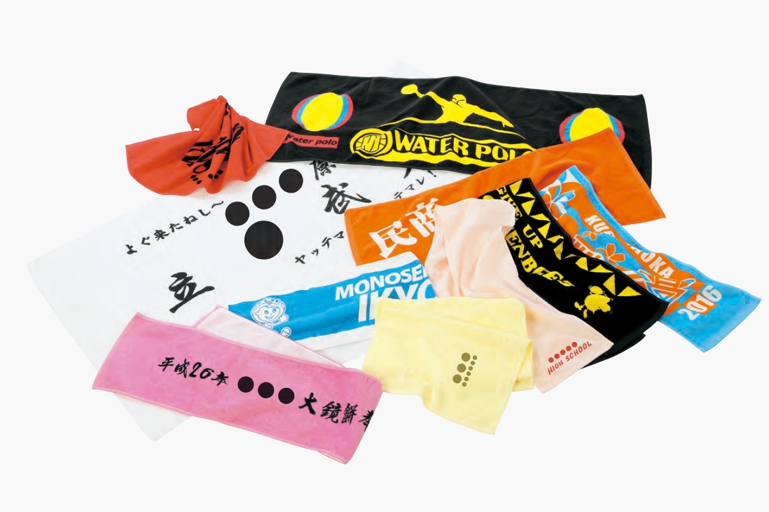 ユニフォーム、作業服、Tシャツ、ポロシャツ、タオル、おしぼりなどへのプリント・刺繍加工を承ります。
